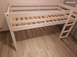 A vendre, lit en bois, en très bon état. Matériaux intègres sans aucune cassure. (acheté chez Conforama 180euros) Surélevé : espace enfant sous le lit pour petit bureau ou coin c