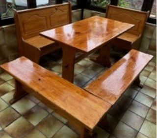 bois en pin table largeur 66* longueur 120 * 75 cm de hauteur Bancs simples * 2 identiques: assise: 30 large* 118 longueur * 45 cm hauteur Bancs avec dossier et rangement