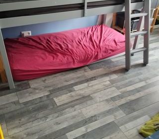 Vends lit surélevé junior , structure en pin massif. l : 98/130 H : 112 L : 198 cm Couchage 90X190 Sommier inclus sans matelas A démonter sur place