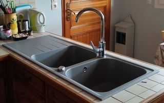 Vends double évier de cuisine en céramique, couleur gris avec mitigeur et système de vidange. Dimension : 116 x 50