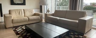 Description 2 canapés cuir vachette finition pigmentée tannage minéral Couleur beige 1 - 3 places 240 x 102 x 85 cm 1 - 2 places 196 x 102 x 85 cm Très bon tat Confortable,