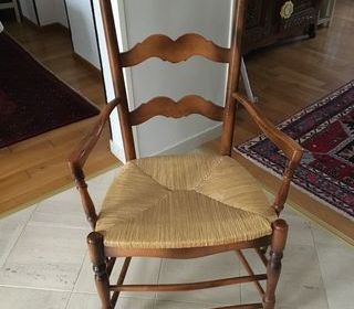 Deux fauteuils en bois , assise en paille , confortables et légers . Hauteur totale : 108 cm, hauteur assise : 45 cm , largeur assise : 50 cm et profondeur assise ; 43 cm. En très