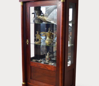 Vitrine de style Empire en acajou une porte vitrée à colonnes détachées marbre 80x40 cm XX siècle. Vitrine à fond de glace (le miroir de mercure est piqué). Étagères en verre Dessu