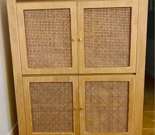 Le grand buffet bas 4 portes Milla d'Habitat est composé de 3 portes en noyer et d'une autre en bois laqué de couleur noire. Ce meuble possède des étagères pour organiser les espac