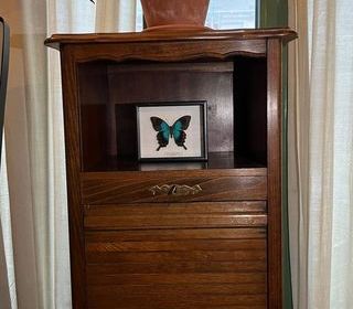 Armoire en bois à rideaux. Cette armoire est en bon état, le rideau ne glisse pas parfaitement mais il se ferme et s?ouvre assez facilement. Merci de m?envoyer un message pour pl