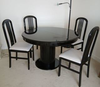 Table de salle à manger avec rallonges intégrées. Laquée noire. 1.16cm de diamètre. Hauteur :0.75cm Une chaise à recoller Possibilité d'achat de la table seule.