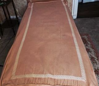 Vends lit une place 90 X 190, tête de lit tissus rose et couvre-lit vendu avec.