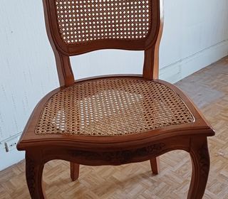 lot de 4 Chaises de salle à manger en bois massif Dossier et assise ( large) en cannage Etat neuf Pieds galbés , style classique