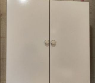 Ensemble salle de bain Blanc liseré gris Poignées rondes blanches avec liseré Miroir avec éclairage 2 spots LED, prise de courant et support tablette Meuble rangement 2 étagère