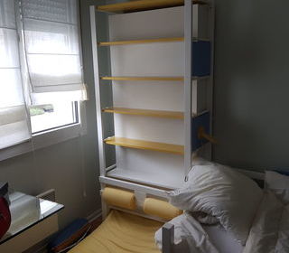 Chambre enfant VIBEL BON ETAT lit de 90x 190 inclus sommier en latte + matelas, deux tiroirs sur roulettes ainsi qu'une bibliothèque intégrant un matelas pour couchage d'appoint de