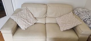 2 banquettes canapés fixes en cuir beige, les coussins d'assises et de dossier sont amovibles, le cuir est composé d'une seule pièce et pas plusieurs morceaux cousus. Les dossie