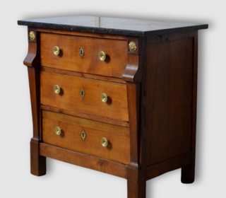 Petite commode néoclassique Empire française du 19ème siècle en merisier 3 tiroirs avec plateau en marbre noire dimensions marbre : 80 cm x 43 cm hauteur 75.5 cm.Livraison en Fran