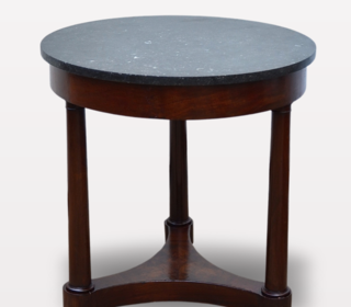 Grand Guéridon style Empire en acajou massif et placage d'acajou XIX?, avec tiroir reposant sur 3 colonnes posées sur une entretoise à flancs concaves. Dessus de marbre granité no