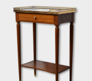 Console desserte rectangulaire en acajou reposant sur quatre pieds fuselés et cannelés réunis par une tablette d'entretoise. Elle ouvre à un tiroir en ceinture. Plateau de marbre b