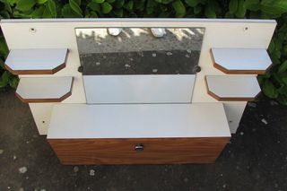 Meuble de salle de bain , authentique de qualité des années 70 en formica blanc et marron, comprenant un miroir , 4 petites étagères et un coffre ouvrant sur le devant, servant au