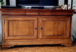 Buffet merisier massif Dimensions Longueur : 1,77 mètre Profondeur : 55 cm Hauteur : 90 cm Tiroirs, façade, côté et dessus en merisier massif Fond et étagère intérieure en chà¢t
