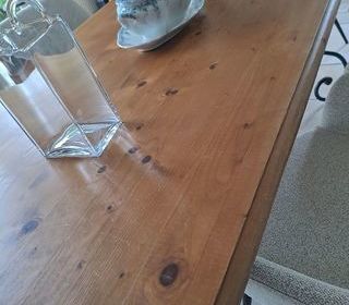 Vends table de salle à manger en pin massif excellent état et six chaises en fer forgé avec coussins