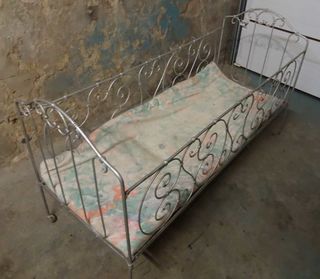Lit ancien en Fer Forgé . Peut servir en lit enfant ou être transformé en canapé . Bon état .Peut se plier .Manque 1 roulette .. Dimensions : H totale : 88 cm. H assise 27 c