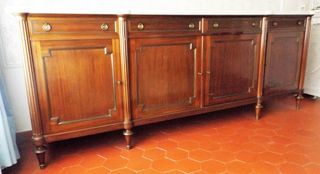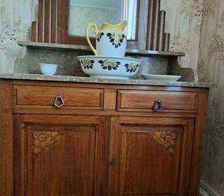 Coiffeuse meuble ancien Dessus en.marbre Miroir en arrière plan largeur 100 cm hauteur au niveau du marbre 98 cm au miroir 170cm profondeur 50 cm