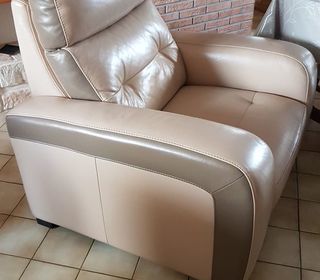 Fauteuil fixe en cuir de vachette bi ton beige et taupe.Très peu servi. (L.100×H.98×P.97). A voir sur place et à emporter. Facile d accès habitation de plein pied. Ne livre pas e