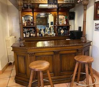Vends bar ancien en bois massif avec canopée, composé d'un comptoir et d'un arrière-bar. Bar de type bar américain traditionnel, avec une inspiration des bars classiques de Chicag