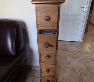 2 range CD en bois avec 5 tiroirs (pin anglais) en bon état. Conception en queue d'aronde et teintés miel. Pas de livraison, à récupérer à Saumur (49)