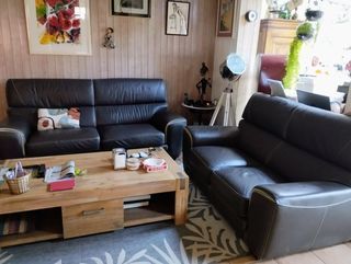 Canapé cuir, 2 places , largeur avec accoudoirs 1,30 m , bon état , Légèrement abîmé derrière le dossier dû au frottement, mais peu visible