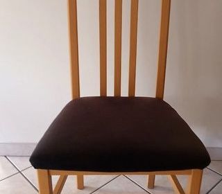 6 chaises des années 80 avec une assise confortable recouverte de tissu beige/marron et avec une structure en bois pin naturel. La hauteur est de 80 cm et l'assise de 47 sur 47. Ch