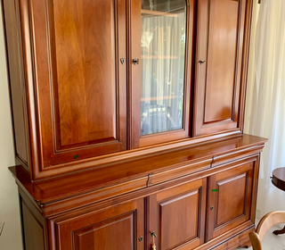 Je cède un vaisselier en bois massif en parfait état, il est comme neuf. Il est en 2 parties. Les 2 portes coulissantes ont un beau vitrage de style aux bords biseautés. Ses dim