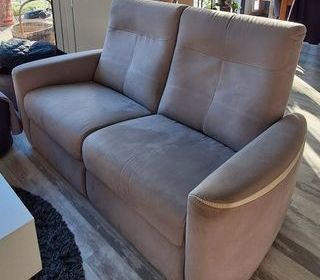 Vends canapé 2-3 places relax électrique avec batteries rechargeables en tissu gris taupe. 3 places assises et 2 places en mode relax Acheté chez Mr Meuble de la marque Simmons.