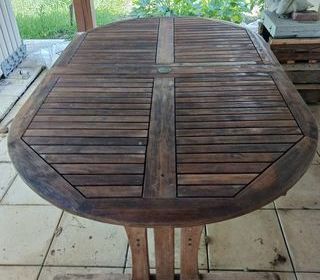 ensemble bois tek EDEN GARDEN = table de 220 x 80 avec 2 allonges incorporées pour 8 à 10 personnes, réservation parasol, 6 chaises teck ^liables, 2 fauteuils teck pliable, ensembl