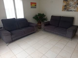 Vends salon très bon état 2 banquettes en tissus gris, avec têtières rabattables. Largeur 2 mètres.entierement nettoyer par shampouineuse professionnelle. Pied inox. Prix: 590