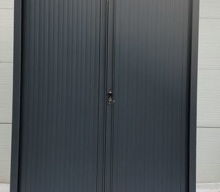 Vends armoire haute métallique gris anthracite portes à,rideaux avec serrure 2 clés fermeture 3 points 4 étagères en très bon état l 120cm x p 45cm x h 198cm