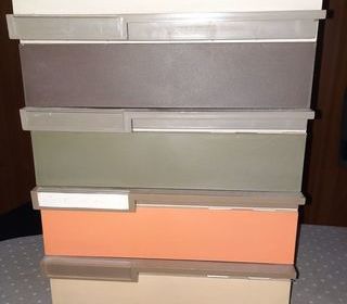 5 modules de classement empilables, dont 3 avec levier. Les tiroirs peuvent être retirés pour faciliter le classement; dimensions H 45 P 36 L 30