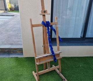 Chevalet d'atelier sur roulettes..4 pieds de soutien et réglage sur l'axe. Matériel professionnel en bois de hêtre. Hauteur environ 190cm.