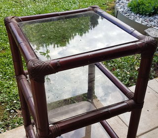 Petite table appoint rotin et 3 tablettes verre. Hauteur 60 cm, côtés de 37 cm. Parfait état. A prendre sur place