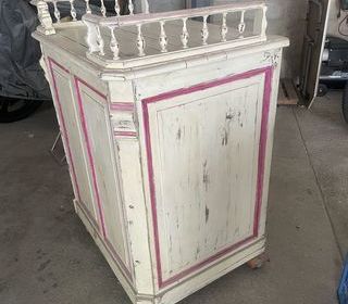 Meuble ancien à deux corps Beaucoup de style pour ce meuble en chêne massif avec de beaux vitraux d'époque, des colonnes et des portes et tiroirs ouvragés. Prix: 200 euros A
