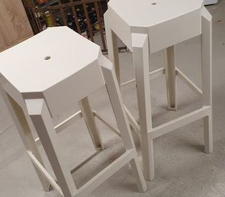Lot de 2 tabourets de bar design blanc en plastique avec repose-pieds résistant à toutes saisons, aux rayons ultra violet, humidité et rayures. Hauteur 75 cm Largeur 36 cm Profo