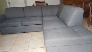Canapé d'angle en tissu gris, avec assises et dossiers rembourrés. Le canapé est convertible et en bon état.