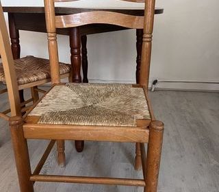 Ensemble composé d'une table rectangulaire avec un plateau clair protégé par une nappe plastique et de quatre chaises rembourrées avec dossier capitonné de couleur sombre. Table 1