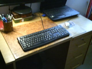Bureau d'occasion en bois, 3 tiroirs dont un se ferme à clé et une tablette (invisible parce que glissée au-dessus des tiroirs) Dimensions : 100 cm x 60 cm. Disponible de suite.
