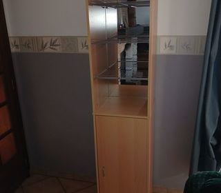 colonne beige bois salle de bain 1 porte (2étagères) 1 niche (3 étagères métal-fil) 2 miroirs haut-bas / socle pivotant à 360° Dim haut 180 x larg 39 x prof 39 cm état neuf / l