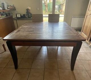Table en bois de 1m60 de longueur + 2 rallonges aux extrémités de 55 cm de longueur chacunes. Table de largeur de 90 cm et 77 cm de hauteur. 4 chaises en bois