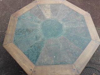 Table basse octogonale dessus chyste piètement et cerclage en chêne massif H=43cm diamètre = 98cm poids = 40 Kgs A prendre sur place, à OSNY en rez de chaussée, stationnement