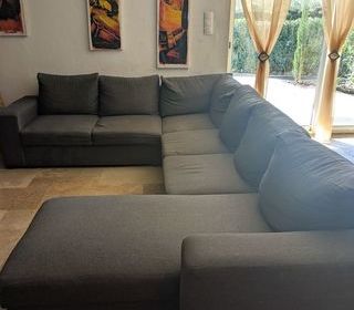 Canapé gris en tissu en état satisfaisant deux angles Dimensions 2 m. 40 x 3. 10 x 1,60 pour la méridienne auteur 0,70 m À venir chercher à Salernes directement