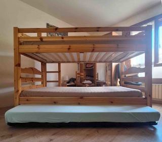 Particulier vend suivant photos un très beau lit "Ibis" en pin, superposé avec sommiers lattes pour 3 couchages dont celui du bas gigogne qui est relevable. Les 3 matelas "Grenad