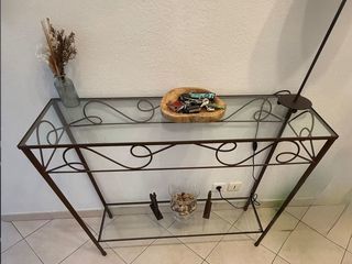 Console élégante Catarctéristiques: Matériaux: fer forgé de couleur cuivre avec 2 tablettes verres. Dimensions: hauteur 80,5 cm, profondeur 30,5 cm, longueur 100,5 cm. Prix: 3