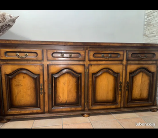 Vend buffet de salle à manger marron en bois massif Bon état Hauteur : 2,05 m Largeur : 2,24 m Profondeur : 0,50 m