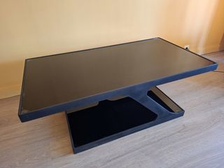 Vends table basse, structure en métal noir, deux plateaux en verre trempé. Dimensions plateau supérieur : 130×70 cm. Dimensions plateau inférieur (posé au sol) : 90×70 cm. Poid