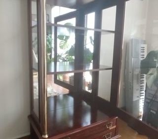 Vitrine bois et miroir ? style classique Belle vitrine en bois foncé avec ornements dorés et fond miroir, parfaite pour exposer de la vaisselle, livres ou des objets de collect